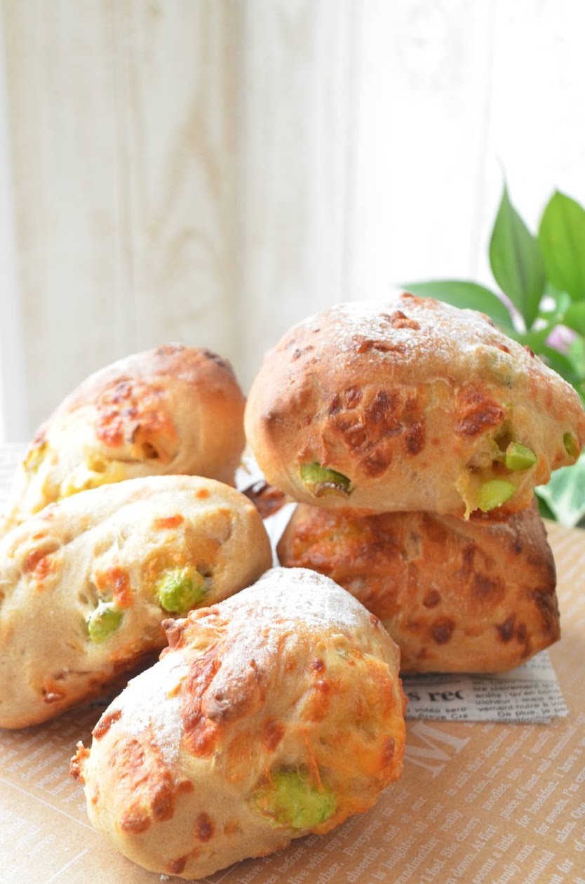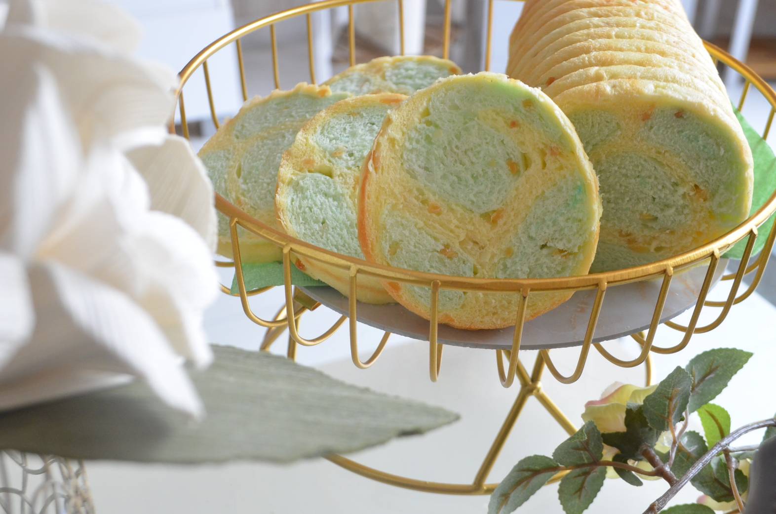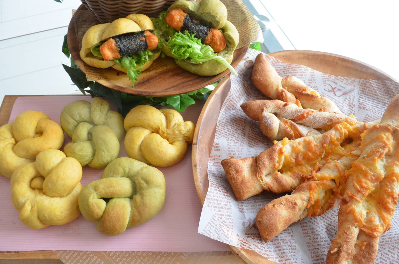 ちりめんじゃことベーコンのスティックパンはチェダーチーズとライ麦を入れ、酸味と塩味のバランスがちょうどいい食事パンです。 菊芋と野菜のカラフルミニバーガー(キャロット&スピナ)、こちらは春のお出かけにぴったりな優しい色味の野菜パン。人参とほうれん草を使って、お花のように成形します。