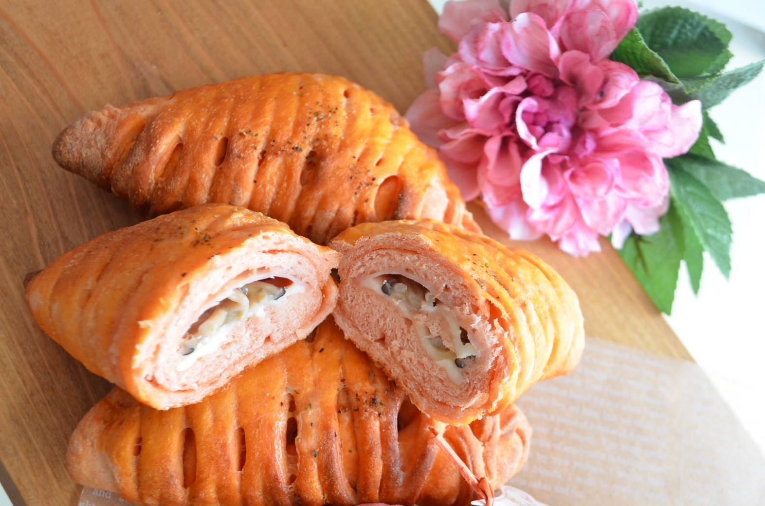 お子様も大好きなゆで卵とハムを巻き、お花の形に仕上げたお惣菜パン。ボリューム満点でお出かけやピクニックにもおすすめです。明太子マヨネーズがアクセントに。