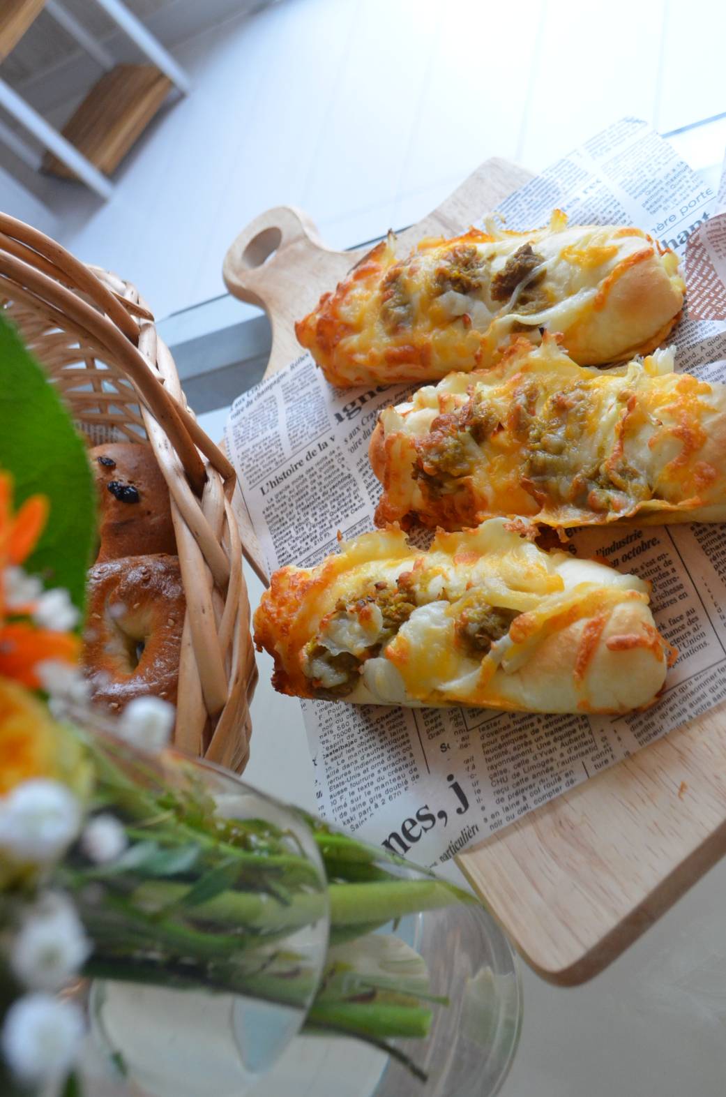 もう一品は、子どもたちも大好きなカレーパンを、スライス玉ねぎとチーズでふんわりサンド。仕上げにパセリの彩りを添えて、みんなで楽しめる優しい美味しさです。